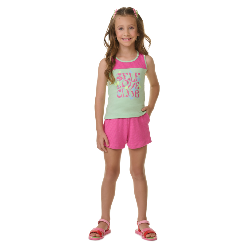 Este conjunto é perfeito para as pequenas num dia de verão. A blusa de cotton e malha Viviene, regata com friso, gola redonda, detalhe recorte em malha Vivienne na parte da frente da peça e apresenta estampa com glitter e escrita: “Self love clube”. O shorts em malha Viviene possui elástico e ribana no cós e bolso nas laterais. Leve e estiloso para um dia de verão.
