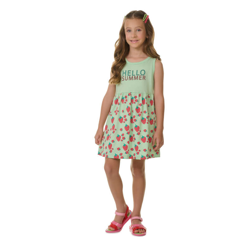 Este vestido em meia malha é perfeito para os dias mais quentes. Com estampa divertida de morangos, detalhes em glitter na estampa e escrita: “Hello summer”, sem manga e gola redonda. Perfeito para o verão.